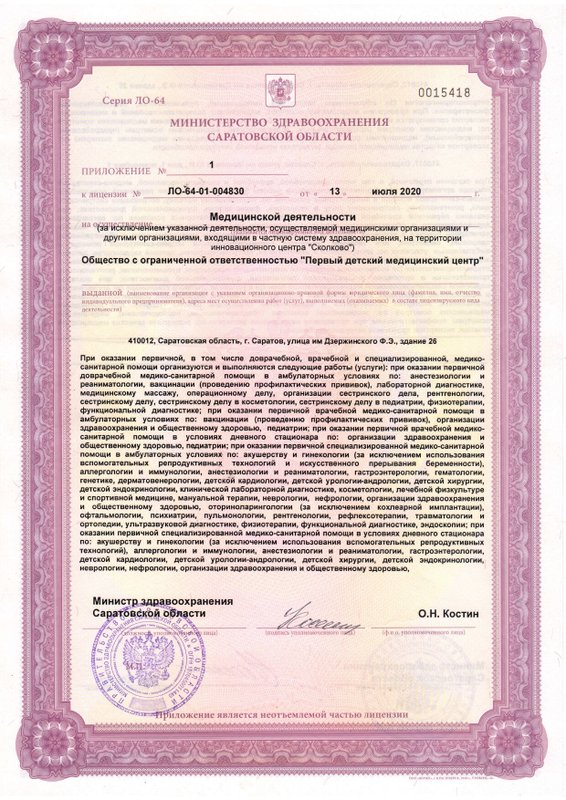 Первый детский медицинский центр - это многопрофильное медицинское учреждение, предлагающее индивидуальный комплекс услуг для каждого клиента. В клинике всё организовано с учетом комфортного пребывания посетителей. Оснащение центра помогает провести диагностику организма пациента для составления плана лечения и профилактики. В клинике открыты отделения анестезиологии, кардиологии, гастроэнтерологии, пульмонологии, аллергологии, иммунологии, нефрологии, гематологии, лечения инфекционных заболеваний, неврологии, эндокринологии, дерматологии, урологии, гинекологии, офтальмологии, оториноларингологии, педиатрии, ортопедии. Наши специалисты имеют высокую квалификацию и внимательно отнесутся к каждой вашей просьбе. Доверяя заботу о своем здоровье нам, вы можете не сомневаться в положительном результате. Также мы поможем с выбором подходящей диеты.
